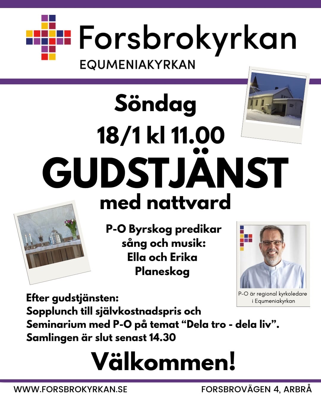 Nyhet Forsbrokyrkans församling i Arbrå söker pastor eller diakon – 50% Publicerat 2026-02-12 Arbrå ligger i natursköna Hälsingland och är ett samhälle med ca 2000 invånare. Församlingen består av ett hundratal medlemmar,... Läs vidare